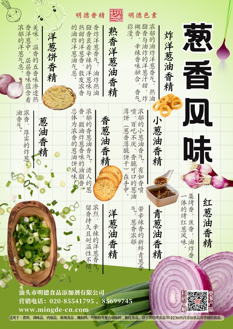 明德蔥香風(fēng)味香精 | 油香蔥韻 覆蓋多場(chǎng)景 汕頭市明德食品添加劑有限公司推出的蔥香風(fēng)味香精系列,涵蓋熟香洋蔥油香精、炸洋蔥油香精、小蔥油香精、香蔥油香精、洋蔥油香精、青蔥油香精、紅蔥油香精、洋蔥餅香精、蔥油香精等多種品類(lèi)。產(chǎn)品呈現(xiàn)真實(shí)蔥香、洋蔥甜香與炸香特征,留香穩(wěn)定持久,適用于醬料、復(fù)合調(diào)味、肉制品、焙烤以及休閑食品等B端應(yīng)用。